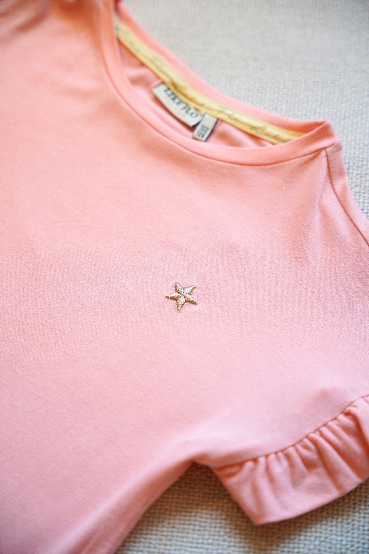 Laat je outfit stralen met de trendy Emma top! Deze off shoulder top is een must-have voor elk modebewust meisje. Gemaakt van een comfortabele stof en met een subtiele glitter print, is deze top perfect voor een zomerse look. Combineer hem moeiteloos met de Rokje Silvana of het panter rokje Senna voor een on-trend geheel!