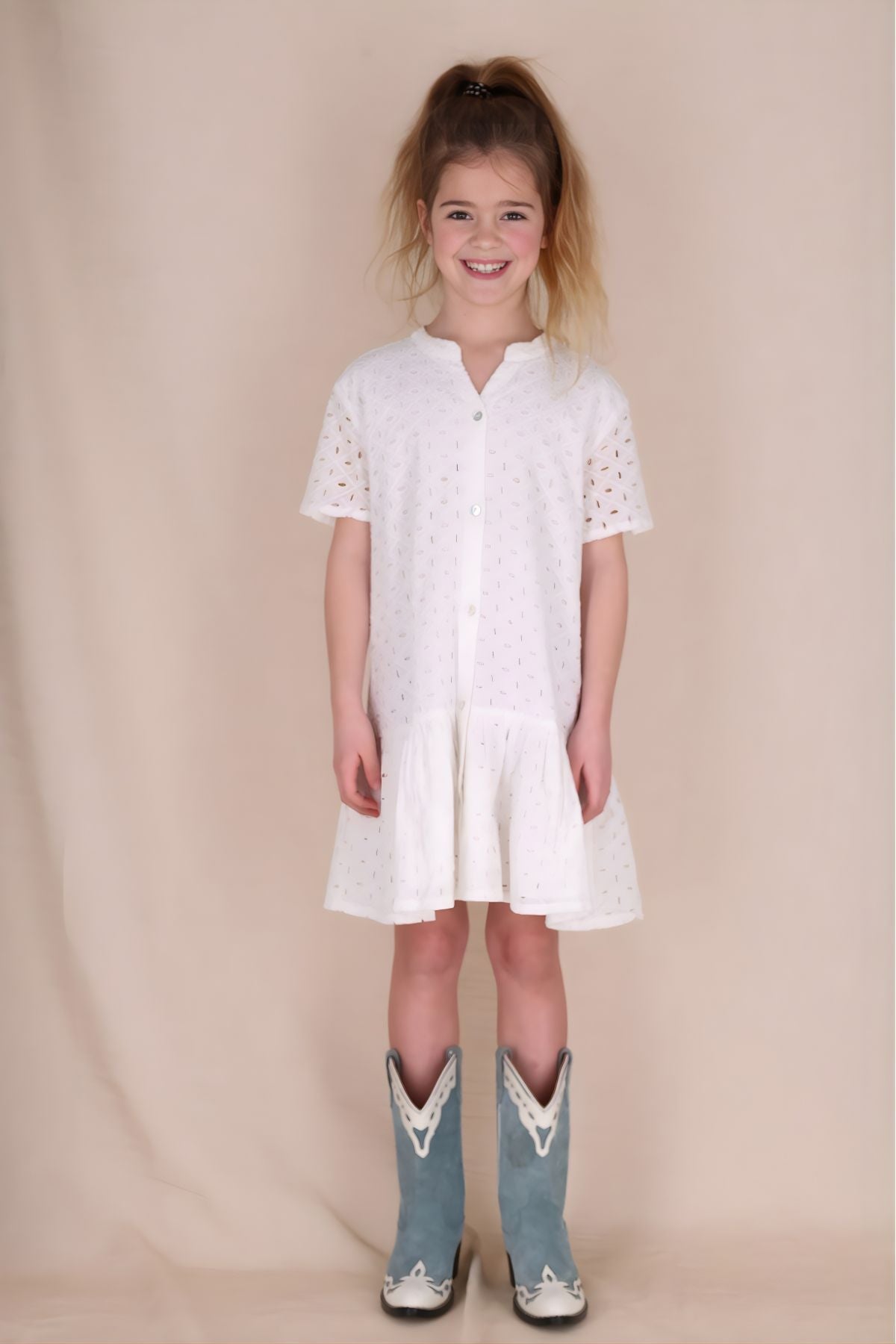 Maak je klaar voor een trendy look met deze Mace Dress! Deze jurk is gemaakt van kwalitatief 100% katoen en is perfect voor elke gelegenheid. Deze veelzijdige jurk is ideaal voor een mooie dag buiten of een feestje. Hij sluit met stijlvolle knoopjes aan de voorkant en is volledig gevoerd voor extra comfort. Combineer het met de sokjes Nola voor een complete uitstraling!• Geschikt voor alle leeftijden en gemakkelijk te dragen!