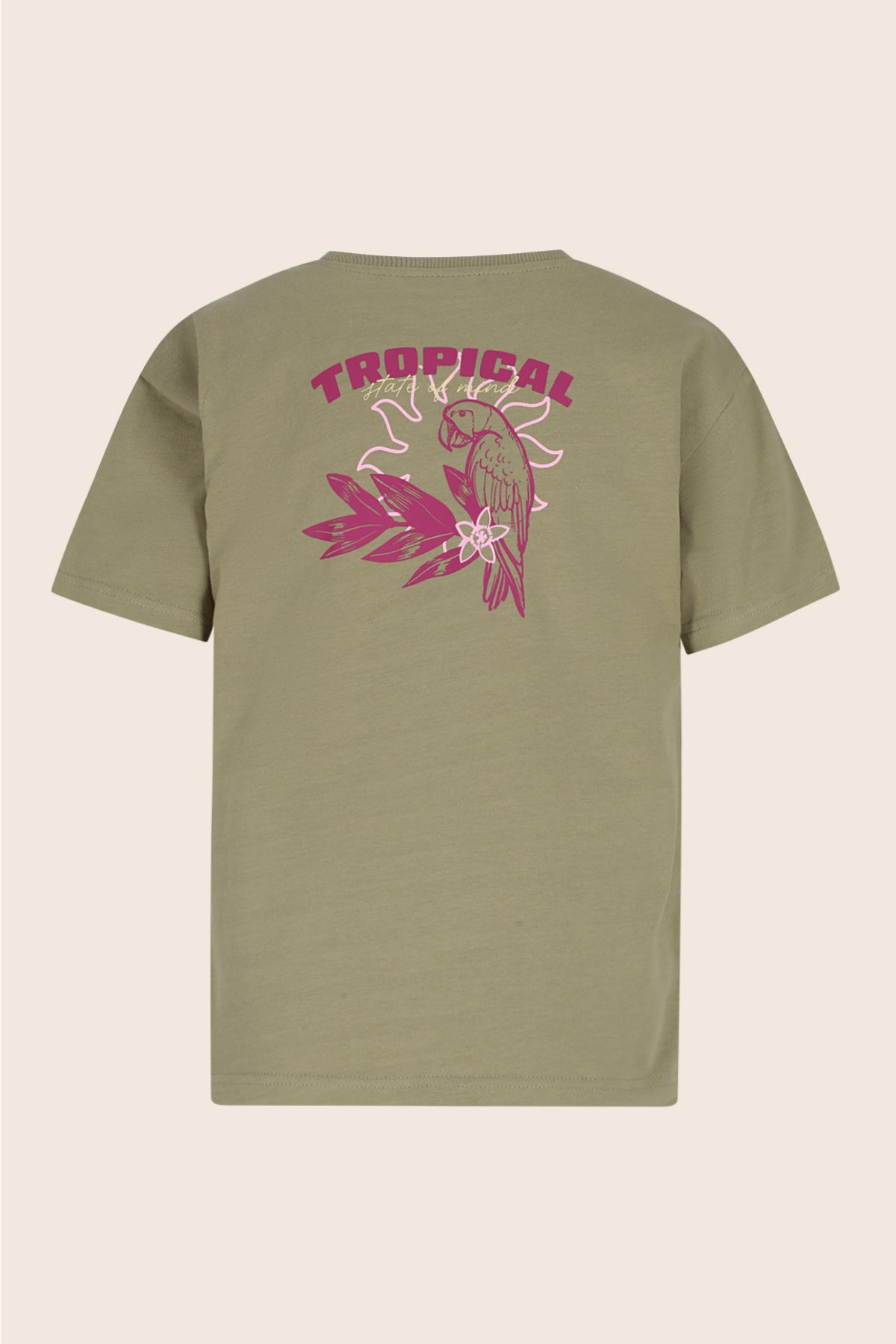 • De heavy jersey tee heeft een subtiele zon borduur op de voorkant en een stoere tropical print op de achterkant.