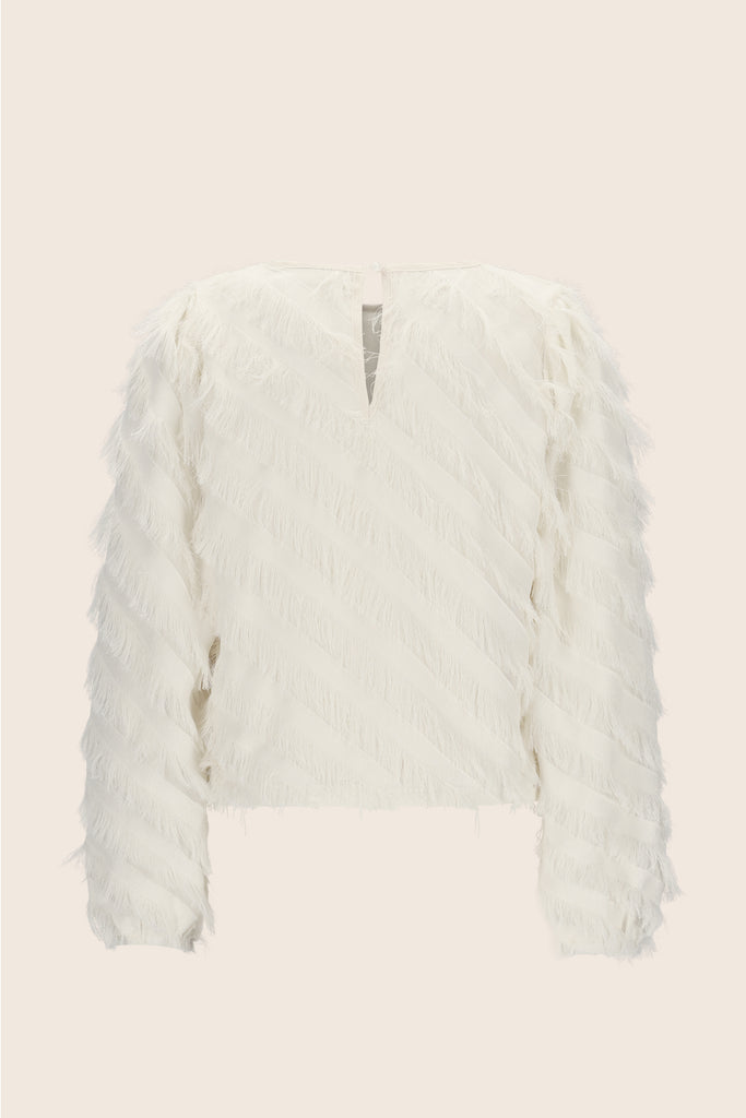 Maak elke outfit compleet met de trendy Ella blouse! Dit unieke item heeft een boxy fit en is perfect om te dragen tijdens verschillende gelegenheden. De blouse heeft opvallende franjes en sluit met een knoopje aan de achterkant, waardoor het een echt must-have is voor de garderobe van elke moderne meid.