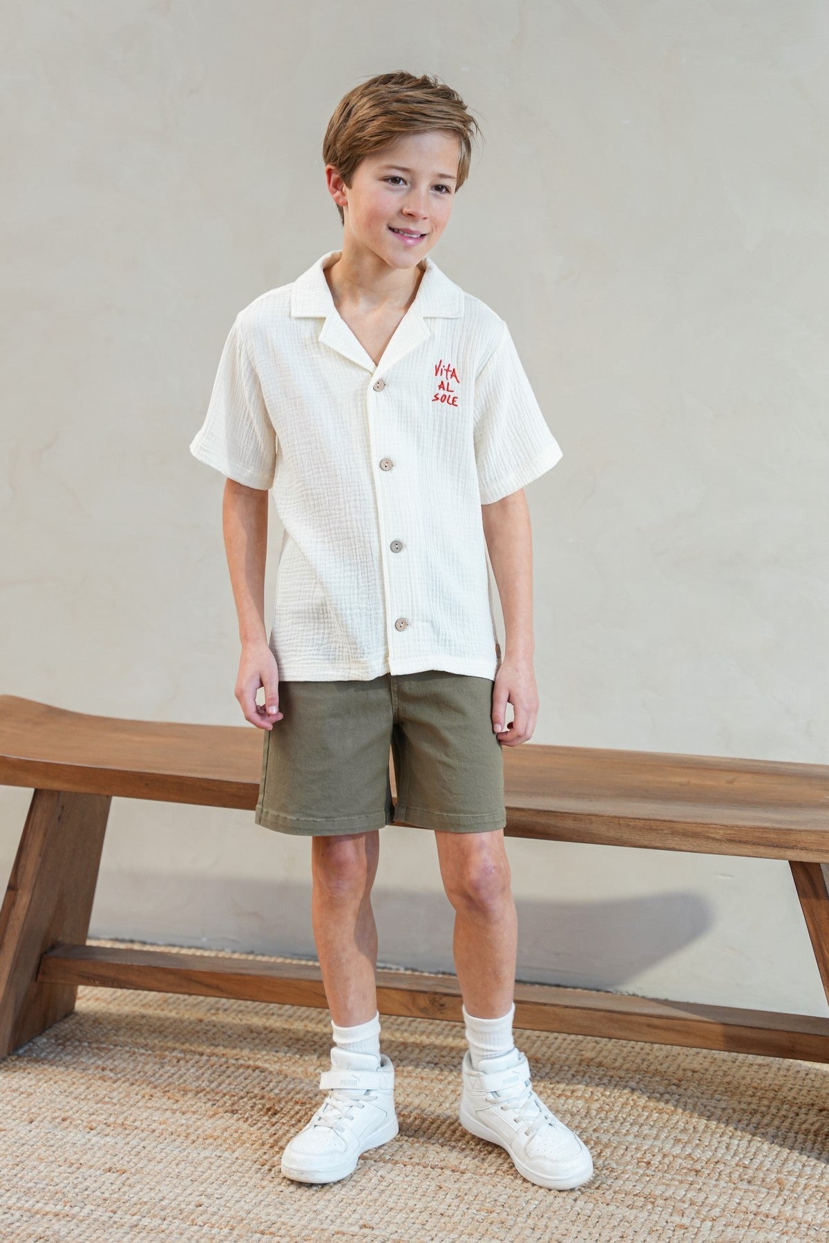 Maak elke outfit af met deze trendy Chelly blouse! Licht en luchtig, maakt deze blouse het perfect voor meerdere gelegenheden. Deze blouse kun je open dragen over een t-shirt of gesloten als een blouse, geschikt voor alle seizoenen. De leuke oranje borduur op de borst met de tekst 'vita al sole' voegt een speelse touch toe aan een klassiek item.• Gemaakt van 100 procent katoen voor optimaal draagcomfort!
