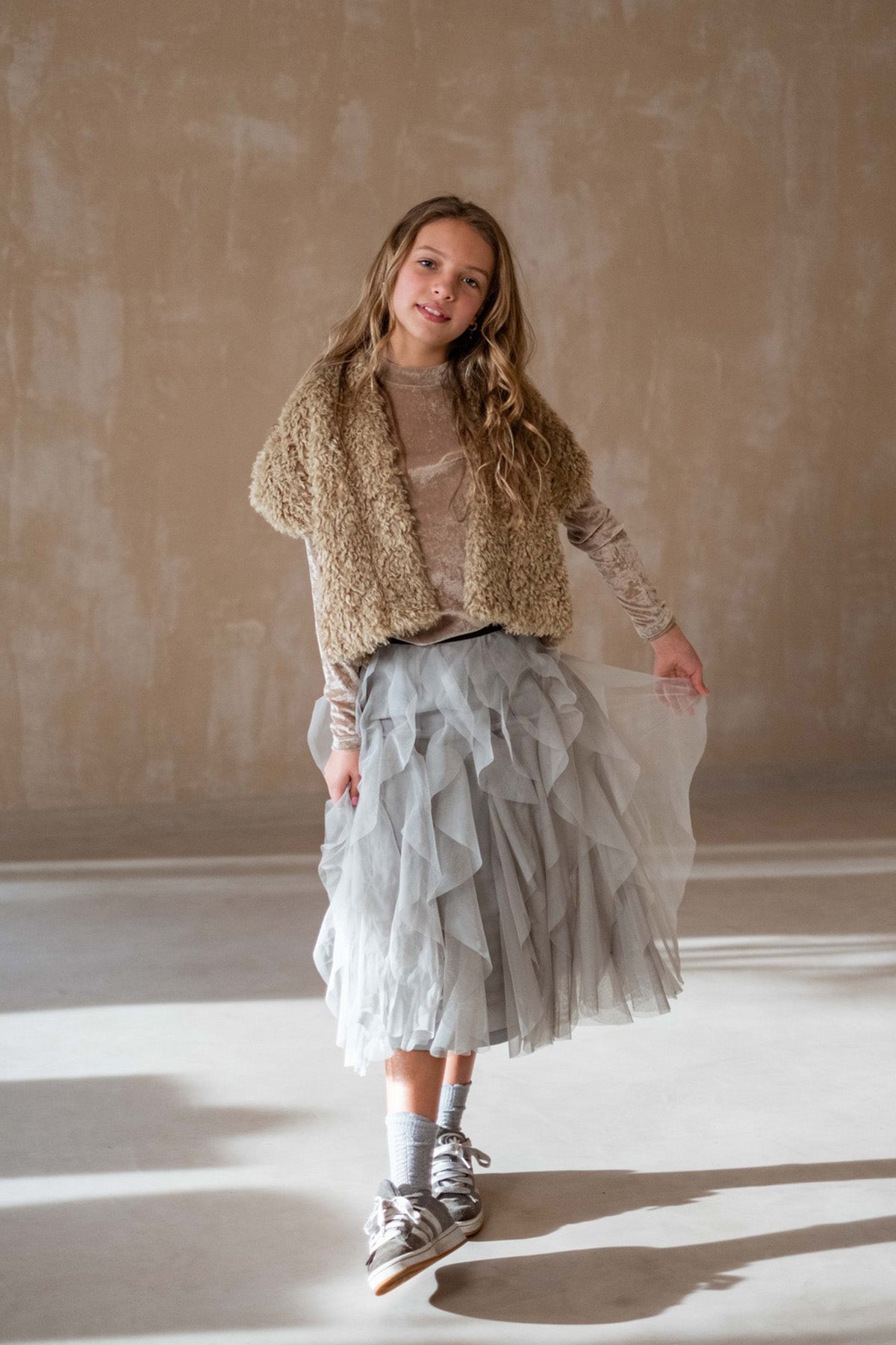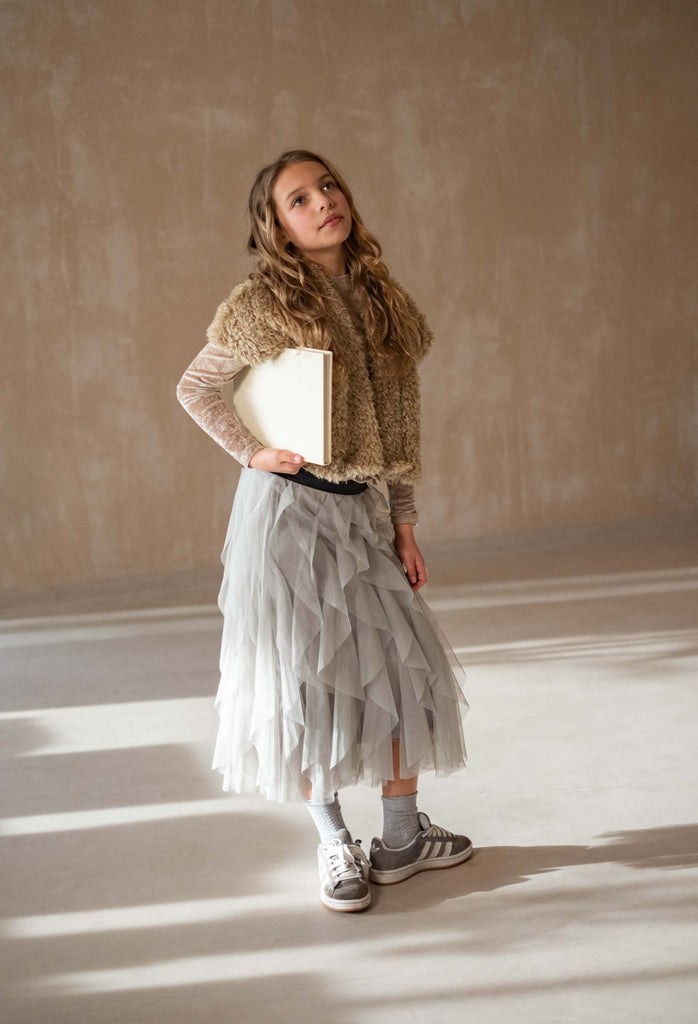 Like Flo Seline Rok – Grijs is een trendy mesh rok die elke outfit laat stralen! Gemaakt van 100% polyester, is deze rok comfortabel en stijlvol. Perfect voor fashionista's, combineer het met top Eline en gilet Djo. Scan de QR-code om de reis van het kledingstuk te ontdekken!