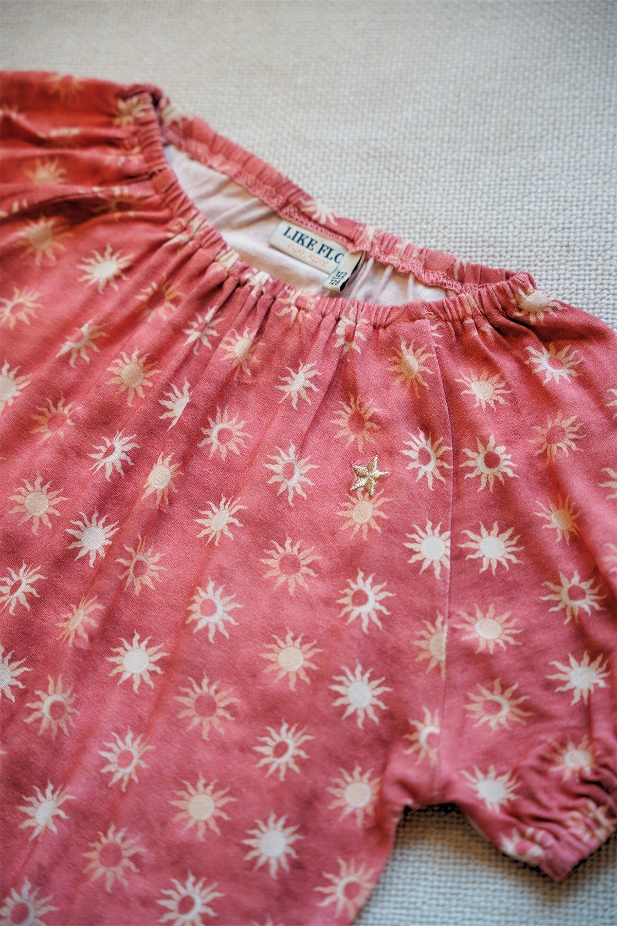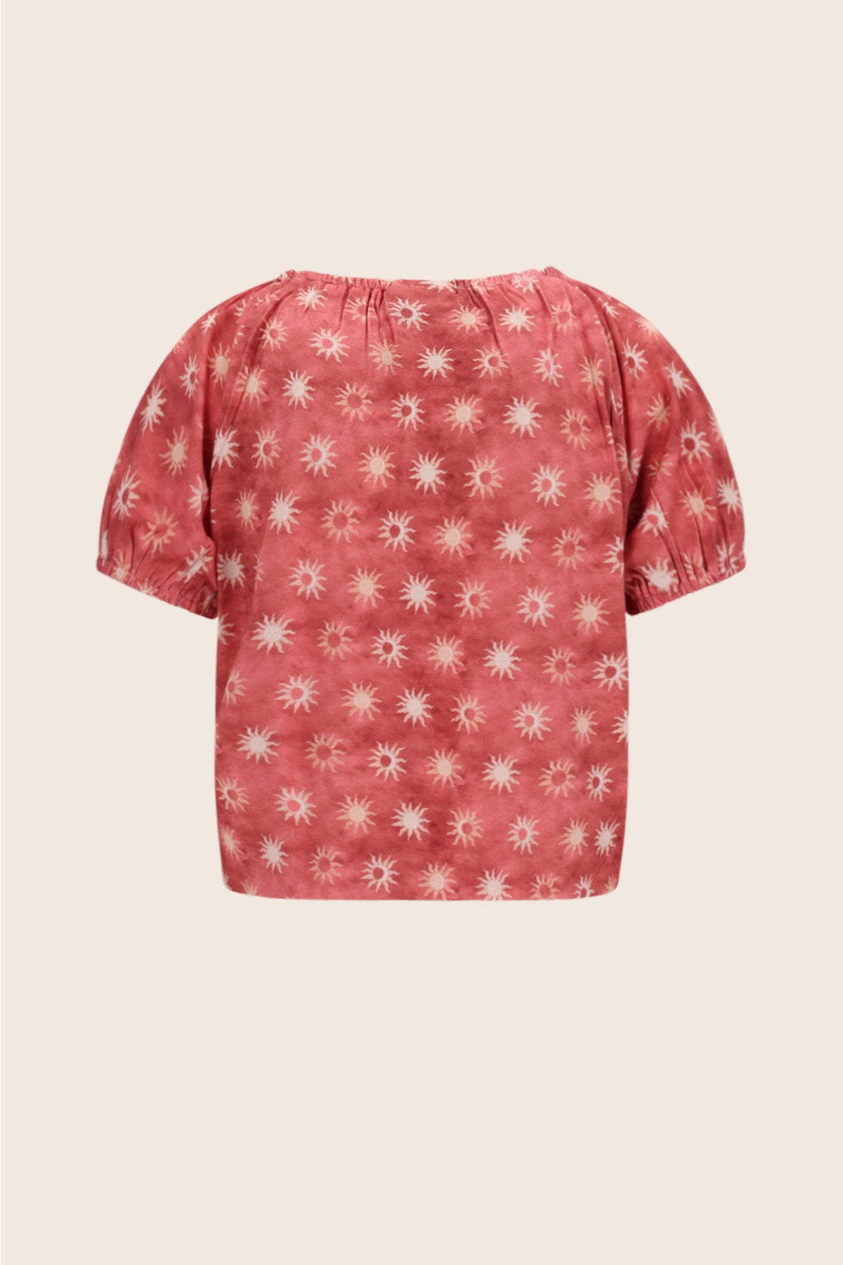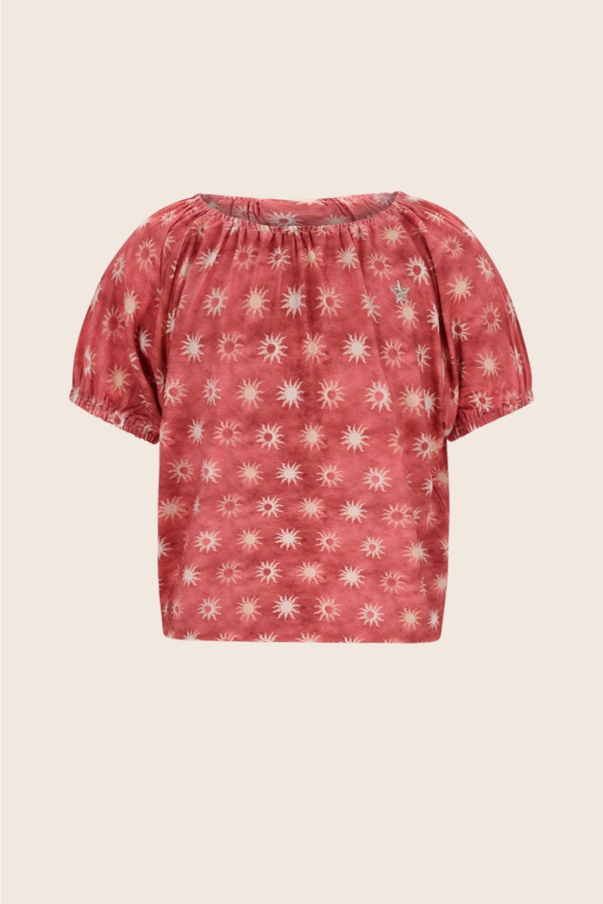 Maak elke outfit compleet met deze trendy El Top Sunray! Gemaakt van een fijne mix die zorgt voor een comfortabele pasvorm en ideaal voor de warme zomerdagen. Deze top heeft pofmouwen en is versierd met vrolijke zonnetjes en maantjes, wat het een uniek en stoer item maakt.