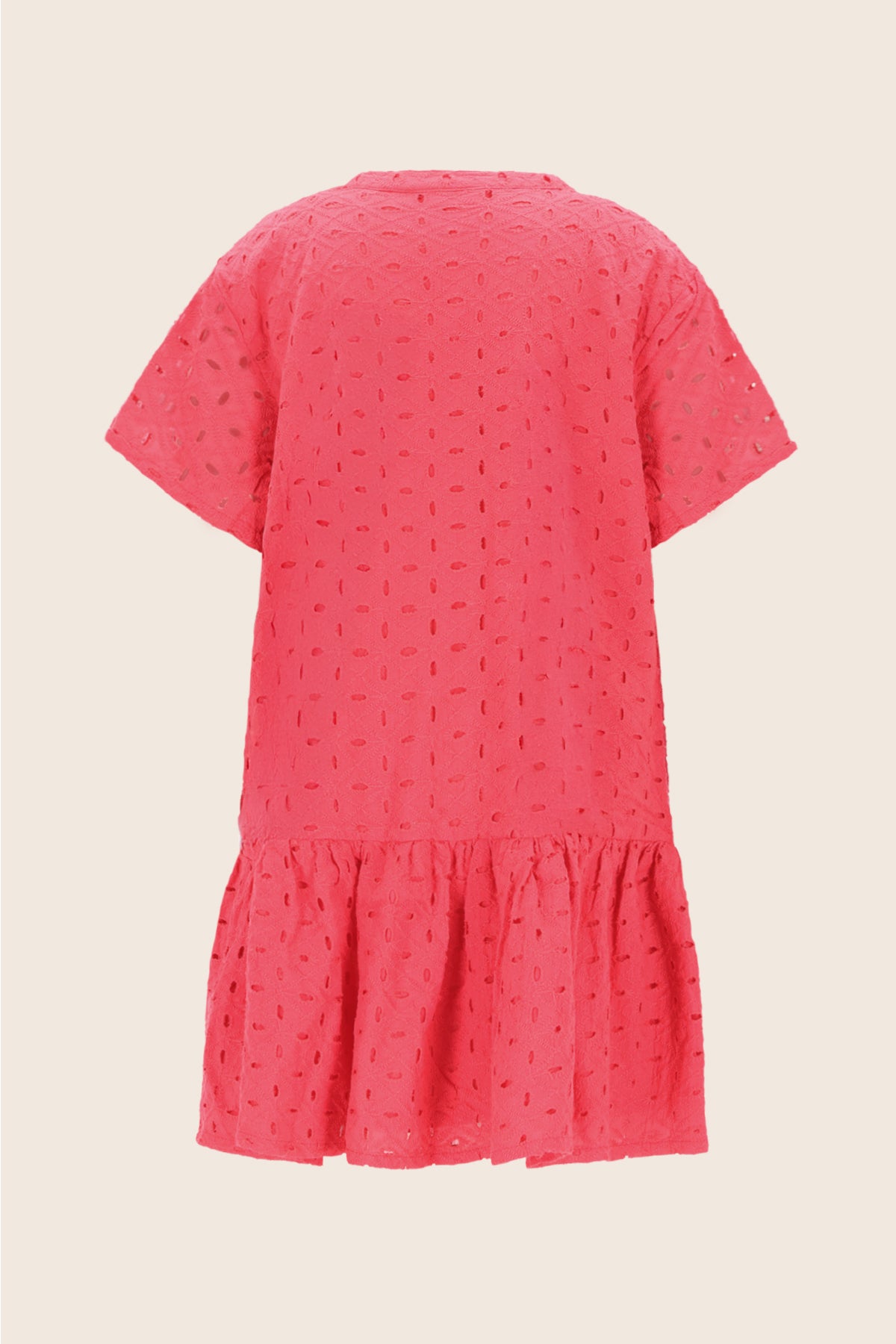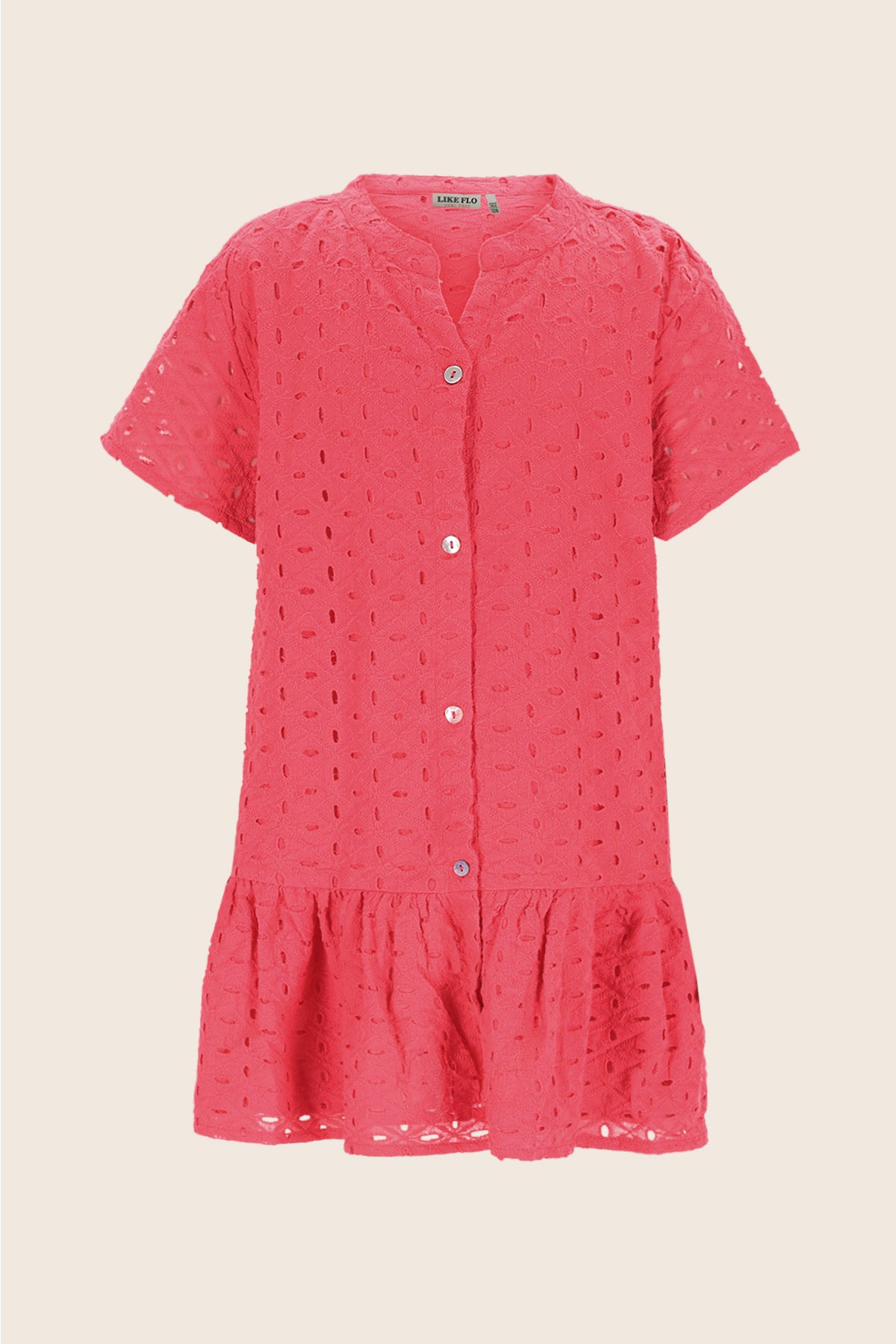 • Jurk met broderie Anglaise stof en knoopsluiting aan de voorkant. Maak deze zomer onvergetelijk met deze jurk!
